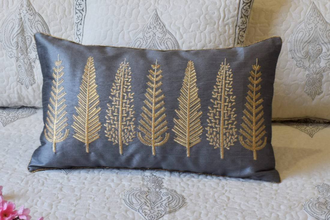 • Embroidered motifs of Baag-E-Bahaar trees with Thousands and Thousands of stitches of intricate Golden Metallic thread on Art Silk cushion covers. It features a Golden Piping trim along the edges.
