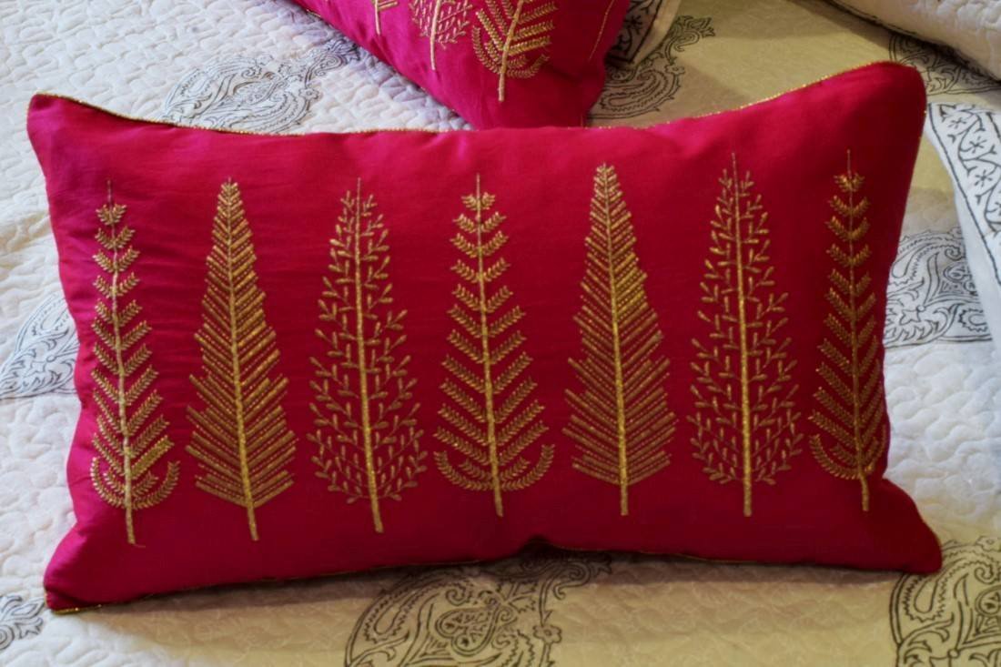 • Embroidered motifs of Baag-E-Bahaar trees with Thousands and Thousands of stitches of intricate Golden Metallic thread on Art Silk cushion covers. It features a Golden Piping trim along the edges.