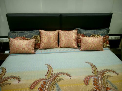 Royal DecoFurnishing envisages a shimmering design overlaid with a resplendent garden of flowers and handloomed with golden leaves all over thats BAGEECHA coming your way. These Bageecha Cushions are woven in handloom brocade in Golden Zari leaves and Oriental Orchid Flower pattern in a range of colors transitioning from the soft touch of peach and coral royalty of Sage Green and Sea Green citrusy boom of Yellow and Beige and egg shell Sky Blue and Grey. Bageecha’ features the fauna and flora of summer gardens.