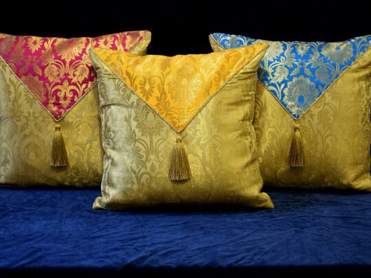 Intricately crafted with a inverted Triangle shaped colourful Brocade on the top with a similar pattern in the marigold colour as a base, edged with a golden piping and a hand made tassel in the centre add a striking finishing touches to the piece that makes it easy to brighten up any room. When grouped together they create an inviting and sumptuous divan or sofa and brings the joy of Luxury, Richness and Warmth to your home Decor.