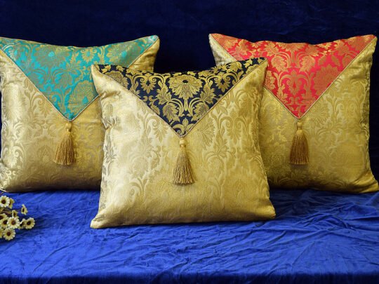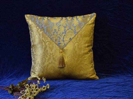 Intricately crafted with a inverted Triangle shaped colourful Brocade on the top with a similar pattern in the marigold colour as a base, edged with a golden piping and a hand made tassel in the centre add a striking finishing touches to the piece that makes it easy to brighten up any room. When grouped together they create an inviting and sumptuous divan or sofa and brings the joy of Luxury, Richness and Warmth to your home Decor.
