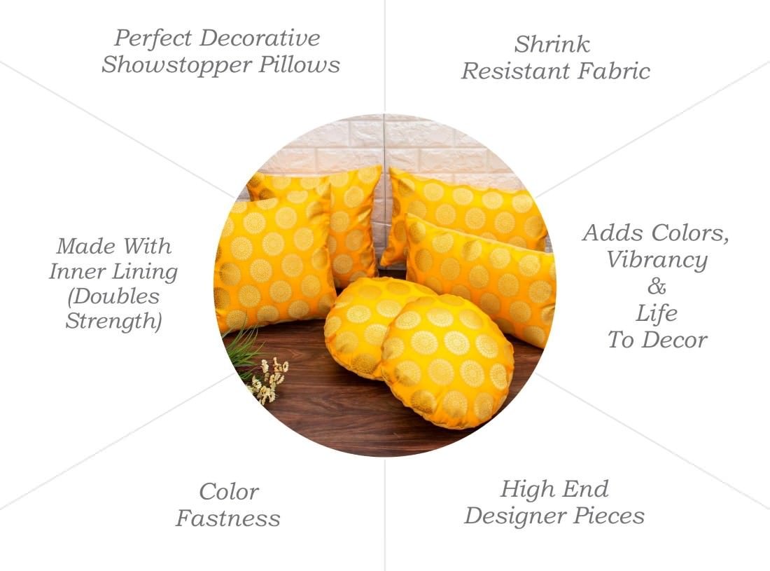 • MATERIAL: Front- Made of premium HANDLOOM BROCADE SILK|Back- Art Silk. These will not loose its Sheen and Colors for the years to come. Stitched firmly with inner lining inside the cushion covers to increase the strength. For Best looks Iron before putting.