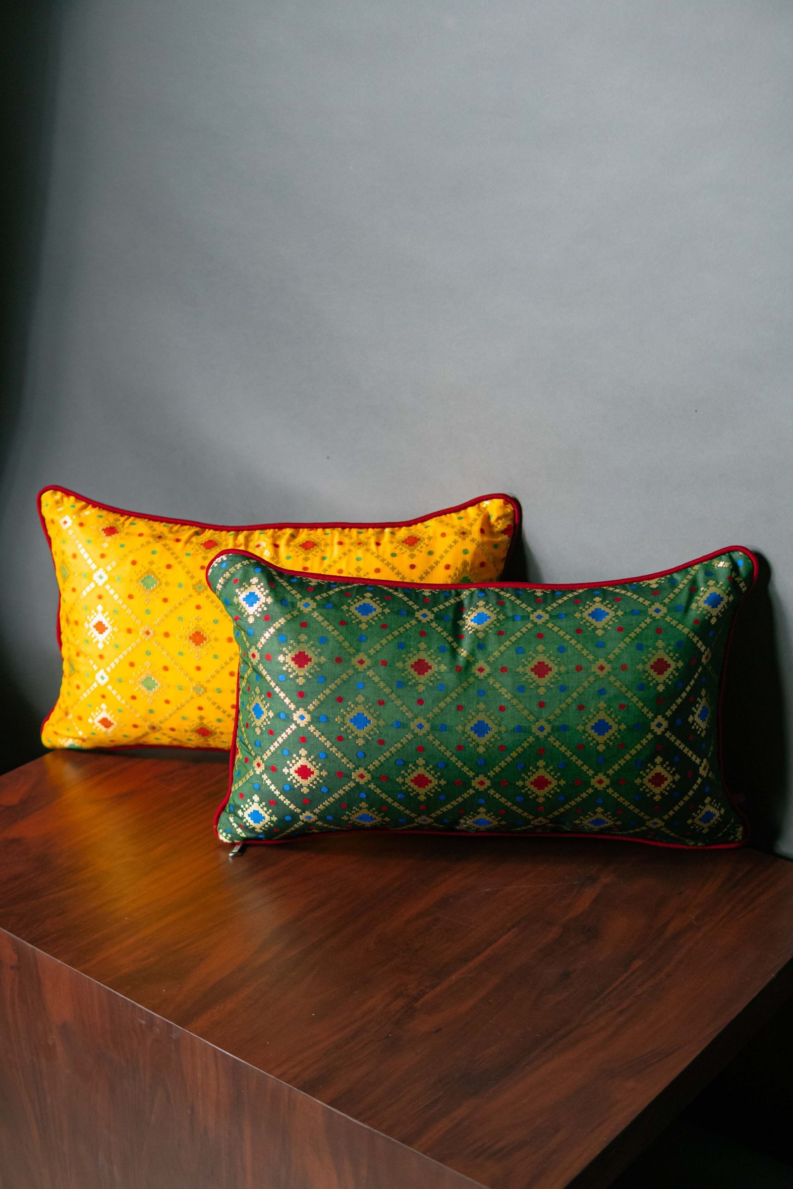 Mesmerizing Colors of Assorted Bandhani Brocade Beauty Rectangular Cushion Covers (Yellow-Green Combo)
