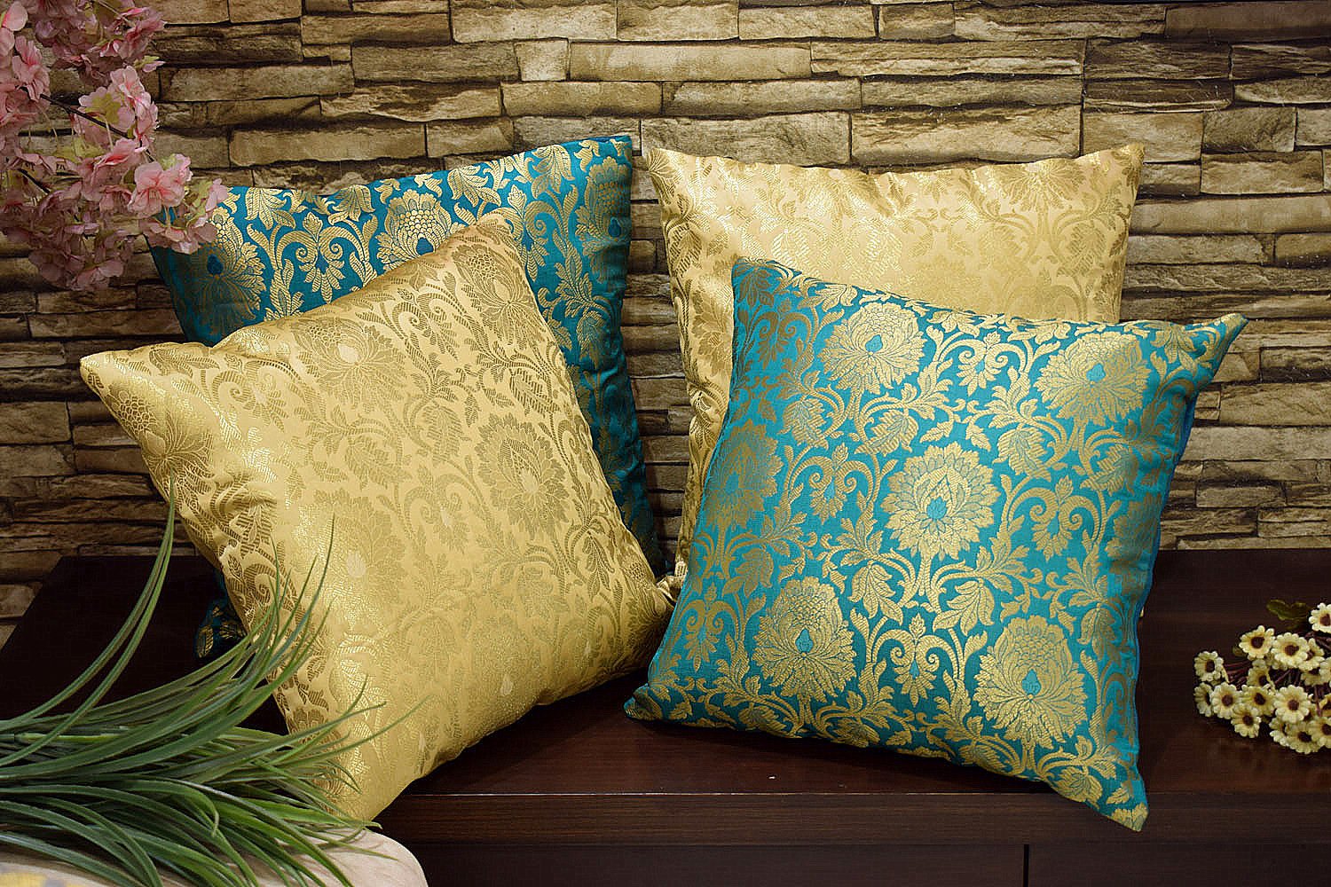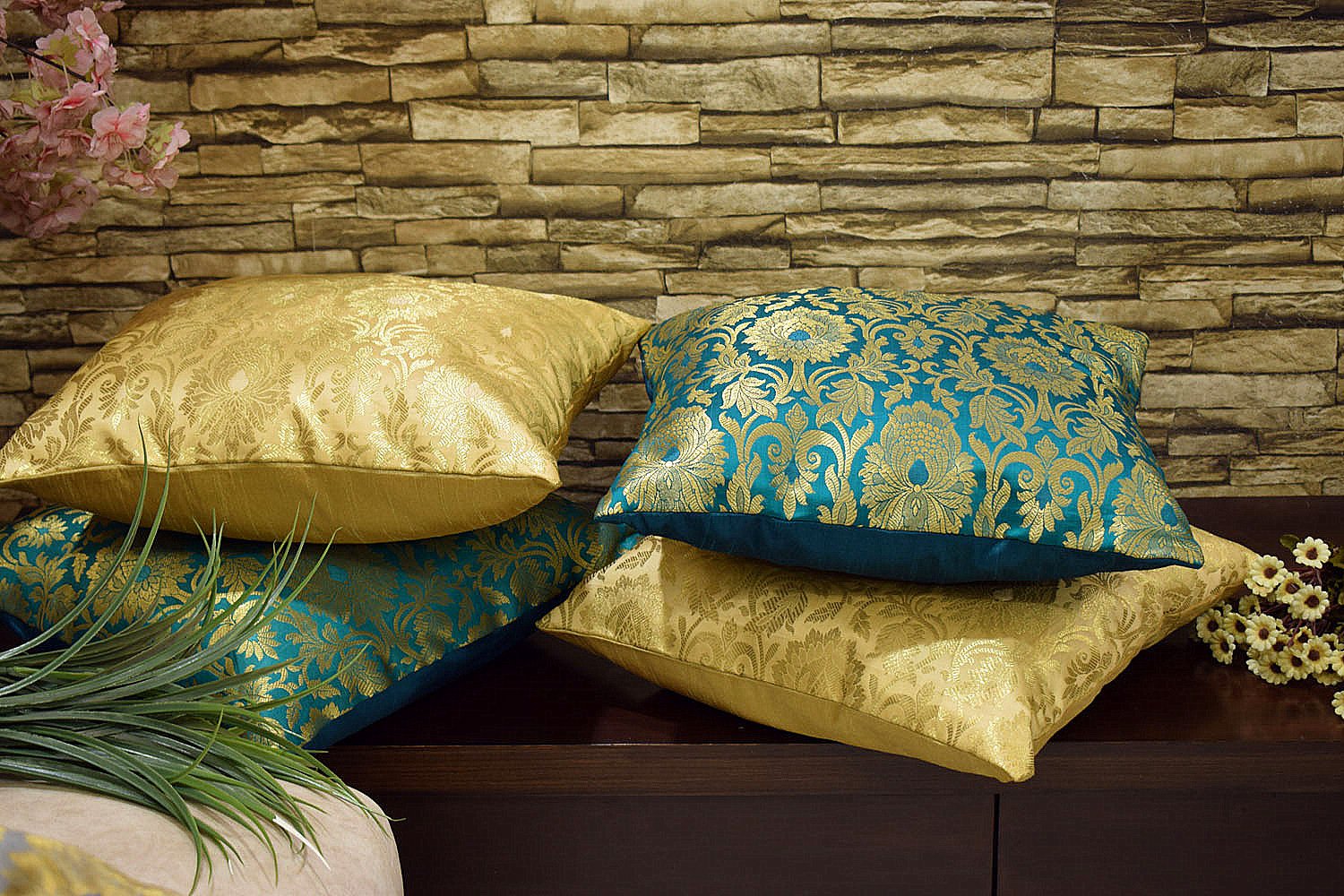 • Design & Art: Golden Zari work Mughal Banarsi Indian Design cushions adding a touch of  Royal & Modern-Classic look to your Decor which means the Aura of your Decor will be Everlasting & never Fading