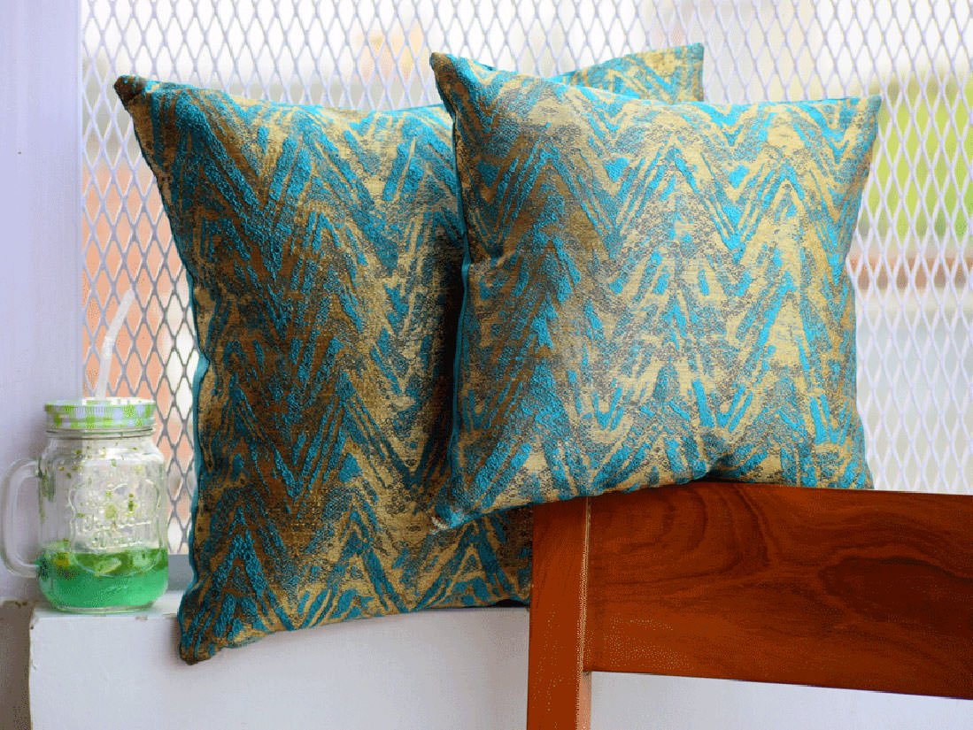 Premium Quality Teal Green & Golden Work Contemporary Zig Zag Design Cushion Covers