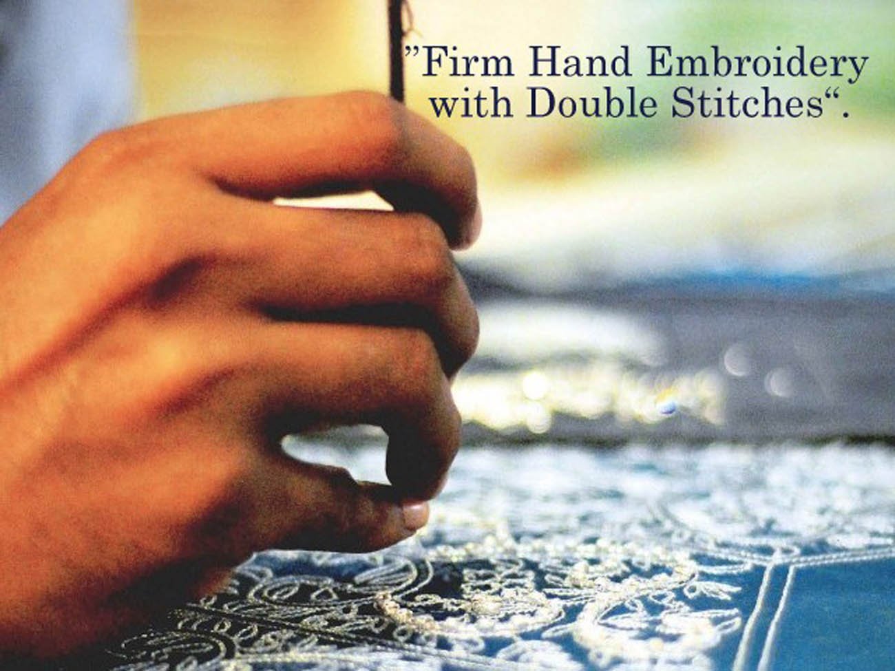 Hand Embroidery is the Symbol of Wealth and Status of the royal families of the previous era and for new era who have Elegance and classy in their taste. It is an expression of self, rendered with patience and dedicated hard work done by the very skilled craftsmen of the country, moreover it is an art rightly described as “painting by needle”. Hand Embroidery adds grace, richness, Elan and elegance, life and style to the Fabric. Its not just an expression, it is the means and art of decoration.