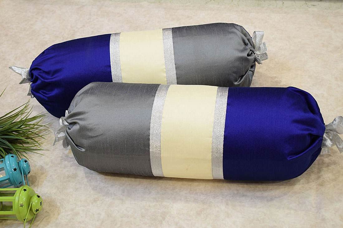 TRI Color Golden Zari Decorative Bolster Covers (Dark Blue, Ivory, Grey)