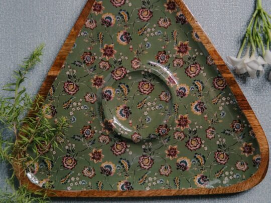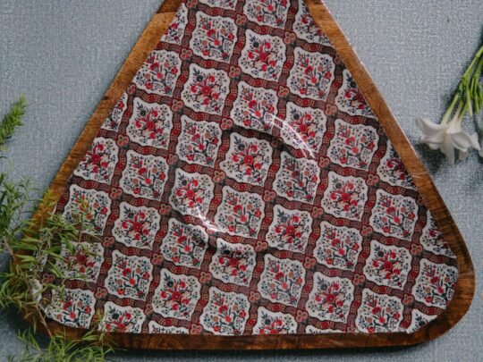 Our signature wooden serving tray collection showcasing the beautiful grain of wood, each organically shaped trays is given a beautiful enamel print which is a fusion of Indian Modern and contemporary designs – a perfect combination of form and function. Crafted by master artisans, each piece is distinct and unique. Made with natural wood, which is food safe and their natural grain hand enameled coating further add a refined touch to these delicately crafted tableware and serve ware, ensuring the timeless beauty of these masterpieces. . The perfect accompaniment to any celebration, big or small, they make for excellent gifts item too.